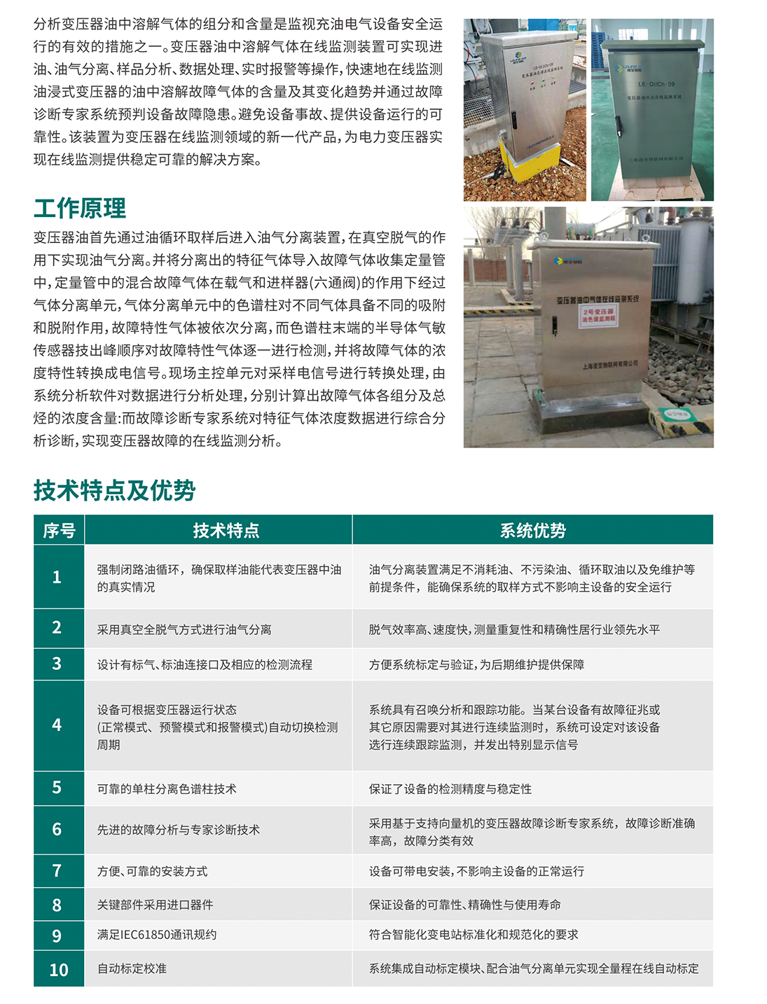 分析變壓器油中溶解氣體的組分和含量是監(jiān)視充油電氣設(shè)備安全運(yùn)行的有效的措施之一。變壓器油中溶解氣體在線監(jiān)測裝置可實(shí)現(xiàn)進(jìn)油、油氣分離、樣品分析、數(shù)據(jù)處理、實(shí)時報(bào)警等操作,快速地在線監(jiān)測油浸式變壓器的油中溶解故障氣體的含量及其變化趨勢并通過故障診斷專業(yè)人員系統(tǒng)預(yù)判設(shè)備故障隱患。避免設(shè)備事故、提供設(shè)備運(yùn)行的可靠性。該裝置為變壓器在線監(jiān)測領(lǐng)域的新一代產(chǎn)品,為電力變壓器實(shí)現(xiàn)在線監(jiān)測提供穩(wěn)定可靠的解決方案。